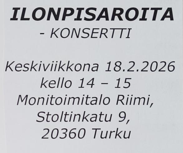 - ke 18.2. kahvitus kello 12.45 - 13.45, Joel Hallikaisen konsertti Ilonpisaroita kello 14 - 15, Riimin kirkkosali.