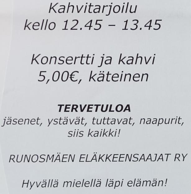 Tuolijumppa on ajalla 15.1. - 21.5. torstaisin kello 13.30 -14.30. Ei tuolijumppaa torstaina 14.5.2026 (Helatorstai). Jumppaamme Yhdessä-yhdistyksen salissa, paikka on K-Market Runoksen talo,…